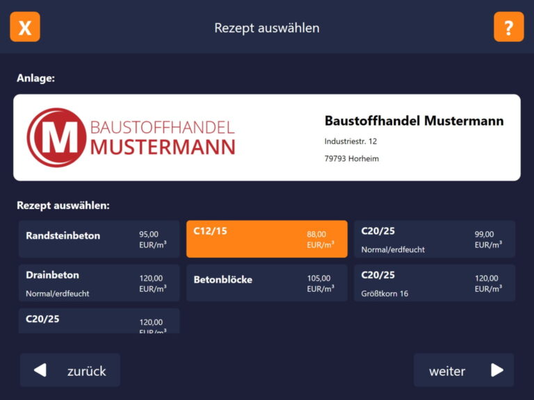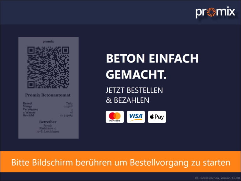 Das promix SB-Bezahlterminal ist die optionale Erweiterung für Ihre Betontankstelle oder Ihren Schüttgutautomaten – jederzeit nachrüstbar. Laufkunden wählen Betonsorte und Menge am Touchscreen, bezahlen kontaktlos per EC-Karte oder Mastercard und starten den Mischvorgang per QR-Code – ohne Kundenkarte, ohne Ticket, ohne Verkaufspersonal. Das SB-Bezahlterminal lässt sich jederzeit nachrüsten.